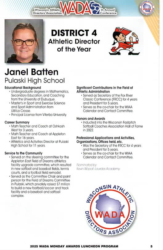 Janel Batten, Athletic Director at Pulaski High School was chosen as the AD of the year by the Wisconsin Athletic Directors Association at the WADA Convention held earlier this week in Wisconsin Dells. The WADA Athletic Director of the Year is chosen from among seven Athletic Directors who were nominated by the their respective Districts around the State. Batten was the District 4 representative, having been selected as the District 4 Athletic Director of the Year last April.